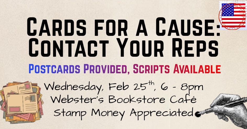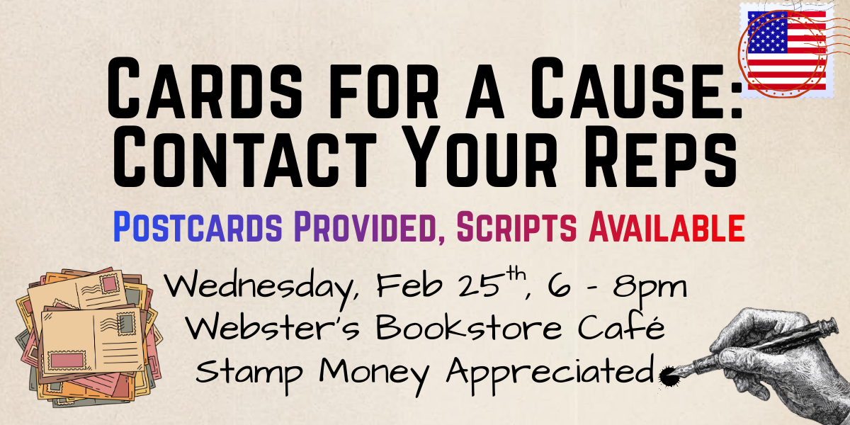 On Wednesday, February 25th, we will be gathering together at Webster’s from 6:00-8:00pm to write postcards to our elected representatives – receiving a large volume of postcards is hard for them to ignore!