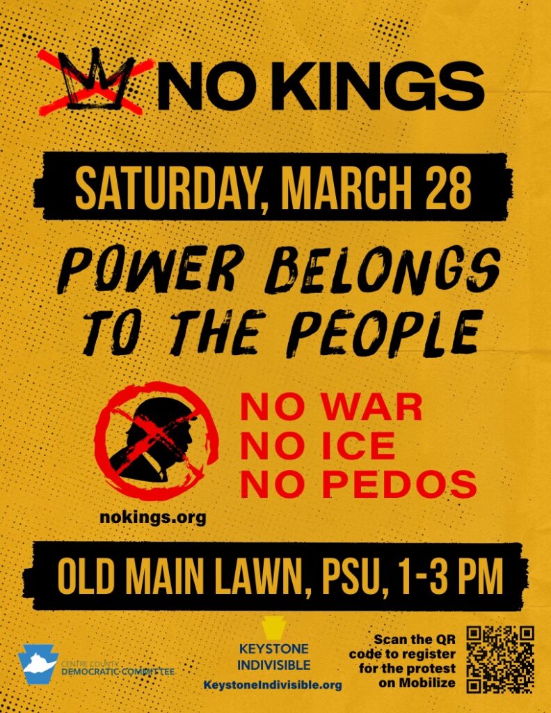 On Saturday, March 28, join us again in State College to rally and march from 1-3:00 p.m. for collective action! Bring a sign, and bring a friend!